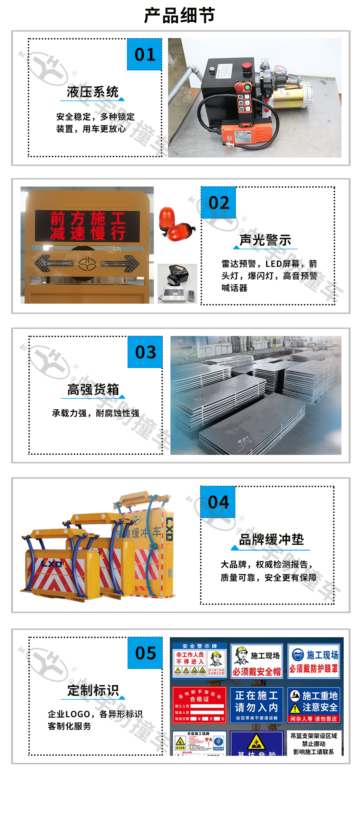 随底盘选装驾驶室。侧防护采用冷弯型钢/Q235-B,螺栓连接;后防护采用冷弯型钢/Q235-B,焊接连接,截面尺寸(宽×高)(mm):50×120,离地高度为:460(mm)。ABS型号/厂家为VIE ABS-Ⅱ/浙江万安科技股份有限公司,选装不同型号的ABS,ABS型号/厂家为:CM4XL-4S/4M/广州科密汽车电子控制技术股份有限公司。该车主要专用装置为防撞包,主要用于失控车辆的阻挡减少经济损失。后部厢体内部安装配重块。选装防撞包样式。工作状态展开样式不计入整车长度。防撞缓冲垫上面自带的作业灯具,仅在作业状态下使用。 |