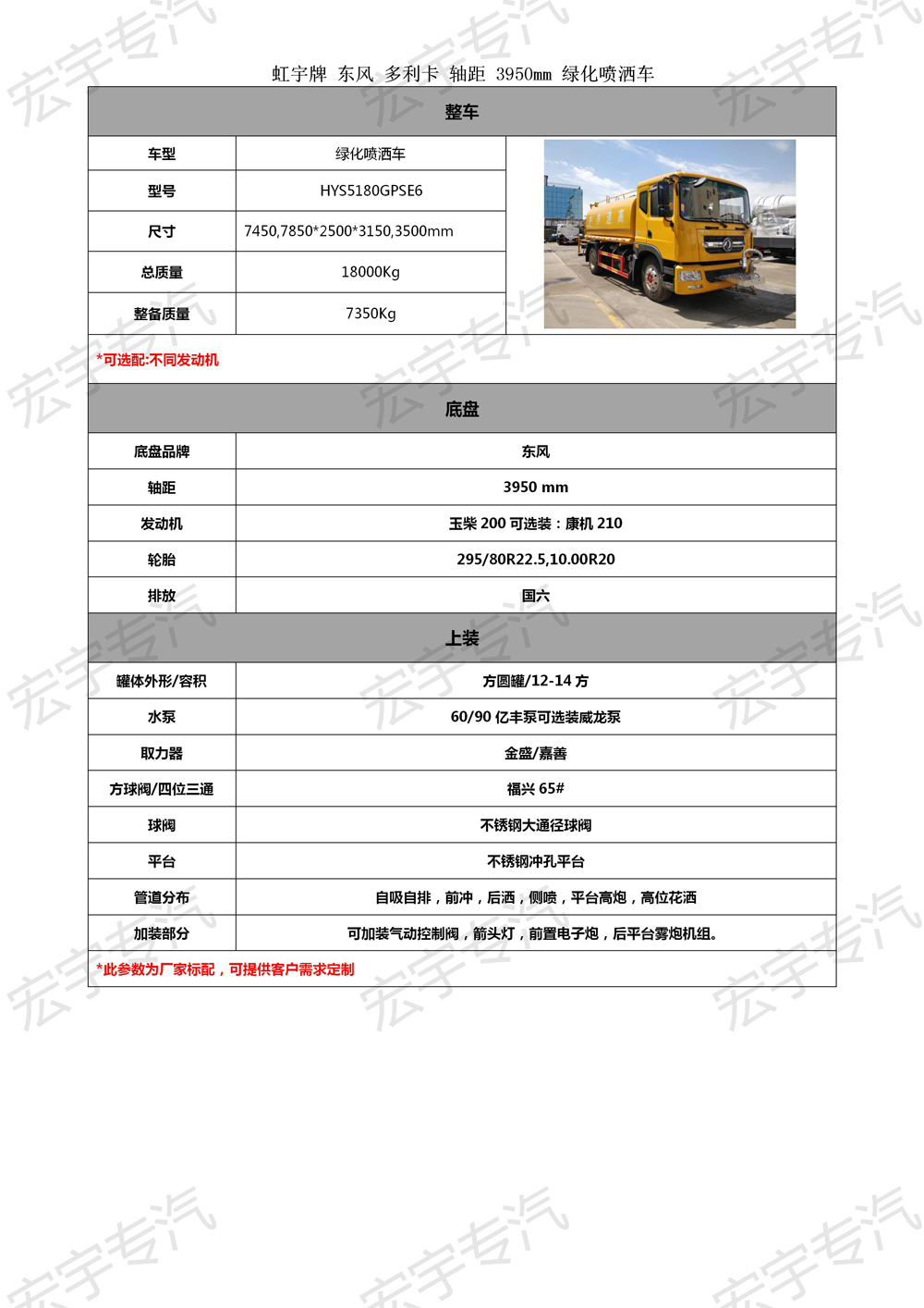 | 虹宇HYS5180GPSE6绿化喷洒车底盘参数 |