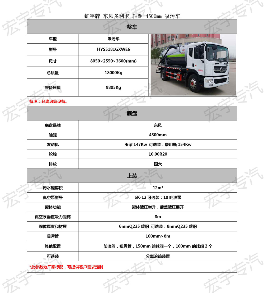 | 虹宇HYS5181GXWE6吸污车底盘参数 |