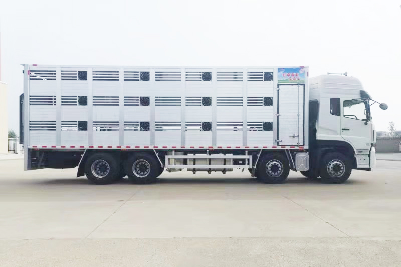 而在国内大型展会上首次亮相的宏宇畜禽运输车则采用东风天龙8X4底盘,配康明斯发动机(国六标准);整车最大载货15吨,车厢主体结构为铝合金材料,最大限度使整车达到轻量化;车厢内设有3层(层高约800mm),每层4个栏每个栏位约5.6平方米,共计12个栏位,车厢有效装载面积为60.4立方,每次最大可运输1450头(6公斤重)禽苗,即可用于禽苗的物流运输,也可用于紧急情况下畜禽的迅速转移。