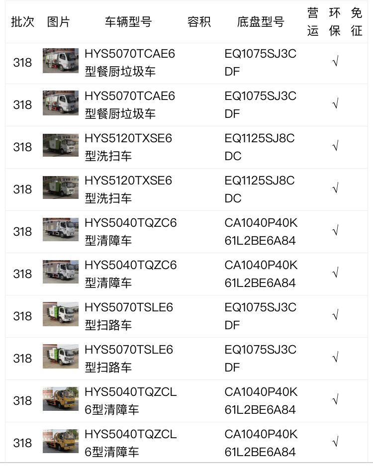 紧跟政策,经过前期紧锣密鼓的研发和申报,截止目前宏宇专汽(虹宇牌)国六车型公告已经下发百余款,车型涵盖清扫车、清洗车、垃圾车、吸污车、抑尘车、污水处理车、清障车等,为用户提供丰富的购车选择。