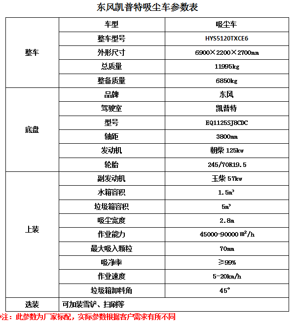 虹宇HYS5120TXCE6吸尘车主要技术参数
