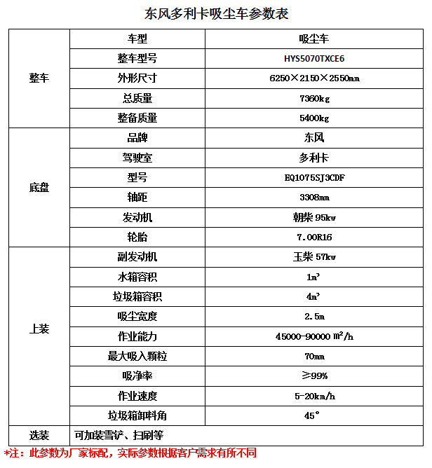 | 虹宇HYS5070TXCE6吸尘车主要技术参数 |