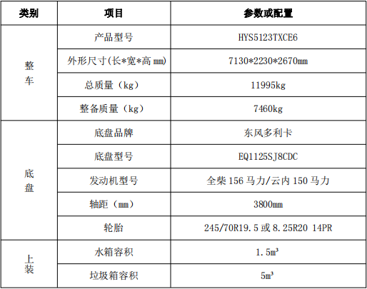 | 虹宇HYS5123TXCE6吸尘车主要技术参数 |