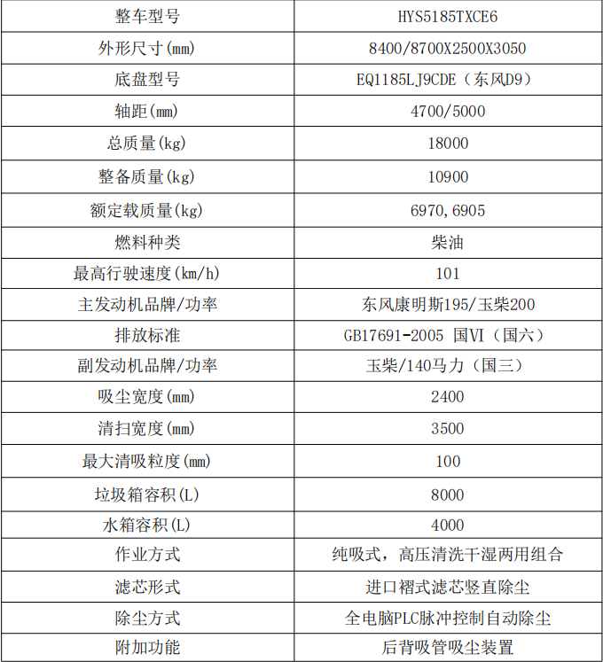 | 虹宇HYS5185TXCE6吸尘车主要技术参数 |