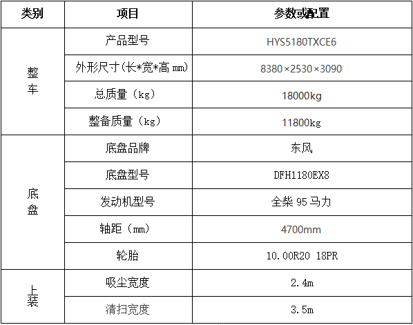 | 虹宇HYS5180TXCE6吸尘车主要技术参数 |