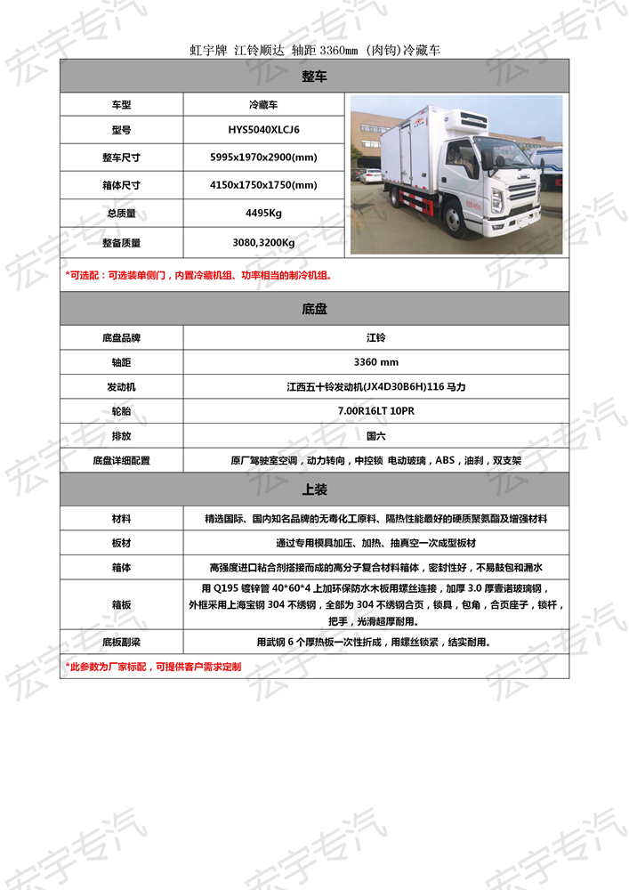 | 虹宇HYS5040XLCJ6冷藏车底盘参数 |