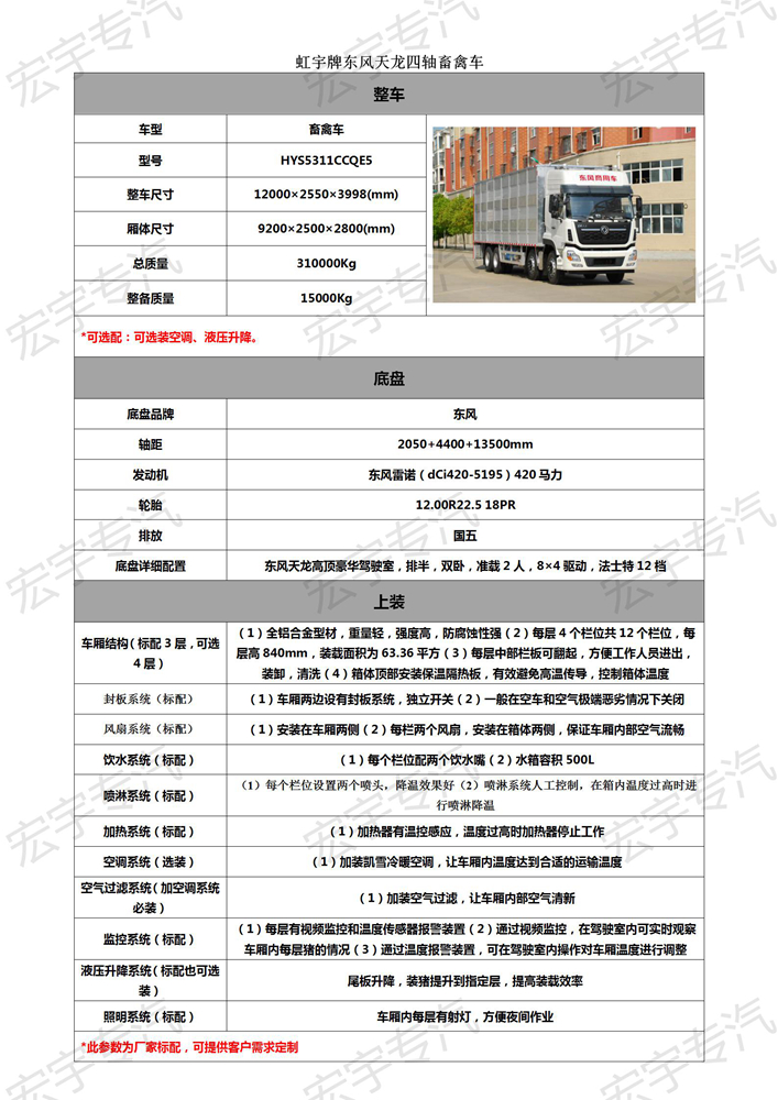 随底盘选装驾驶室,选装仓笼样式,选装箱体前部安装水箱,选装仓笼前端安装箱门,选装液压尾板,后部液压尾板收起状态长度为300mm。侧防护采用冷弯型钢/Q235-B,螺栓连接;后防护采用冷弯型钢/Q235-B,螺栓连接,后防护截面高度尺寸120mm,截面宽度尺寸50mm,下边缘离地高度500mm。ABS型号/生产厂家:3631010-C2000/东科克诺尔商用车制动系统(十堰)有限公司,ABS 8/东科克诺尔商用车制动系统(十堰)有限公司。安装具有卫星定位装置的行驶记录仪。发动机型号/油耗申报值对应关系为:ISL9.5-315E51A/37.3,ISL9.5-340E51A/37.3,ISL9.5-360E51A/37.3,dCi350-51/37.3,dCi385-51/37.3,dCi420-51/37.3,DDi75S315-50/37.3,DDi75S350-50/37.3,ISL9.5-400E51A/37.3,dCi450-51/37.3,dCi465-51/37.3 。轴距/前悬/后悬对应关系为:1850+4600+1350/1500/2700,1850+4600+1400/1500/2650,2050+4400+1350/1500/2700,2050+4400+1400/1500/2650,1850+4100+1350/1500/3200,1995+4600+1350/1500/2555,1850+4600+1350/1480/2720,1850+4600+1400/1480/2670,2050+4400+1350/1480/2720,2050+4400+1400/1480/2670,1850+4100+1350/1480/3220,1995+4600+1350/1480/2575.该车用于运输牲畜和家禽,主要专用装置为食斗槽和仓栏厢。 |