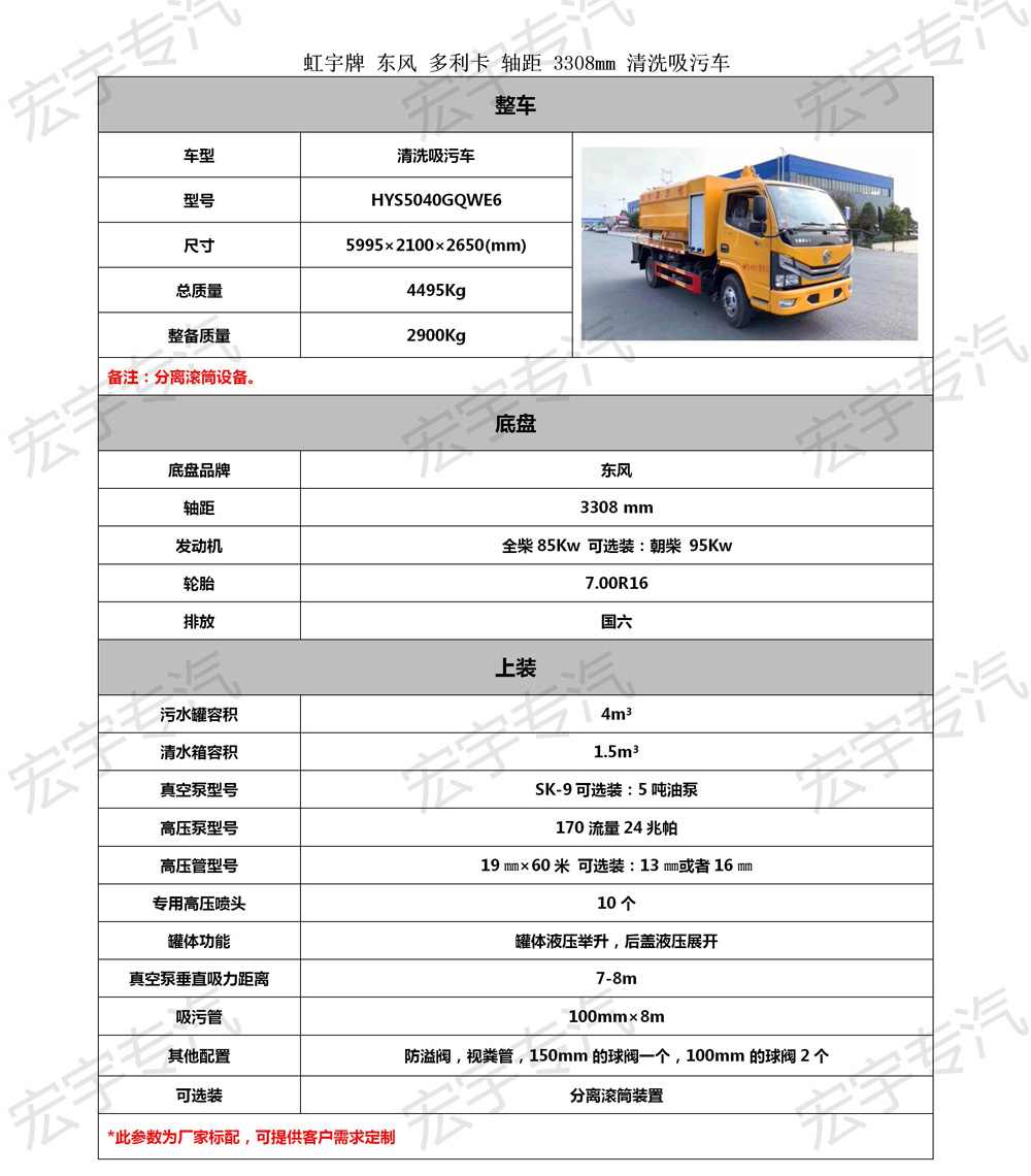 虹宇HYS5040GQWE6清洗吸污车主要技术参数